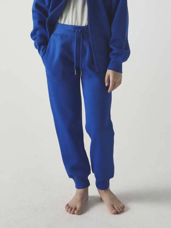 70% cotone pettinato, 30% poliestere. Pantaloni da bambino felpati internamente, tasche a filetto dello stesso tessuto, tasca posteriore con toppa, cordoncino in tinta con estremità in plastica. Etichetta strappabile. Tessuto interno in cotone e poliestere ed esterno 100% cotone.